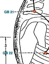 On the Gall Bladder meridian, located on the shoulder directly above the nipple at the highest point of the shoulder. Generally found by moving your finger lightly from your shoulder towards your neck until it stops and then pressing down where it is most tender.