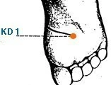 On the Kidney meridian, located on your sole, in a depression with foot in plantar flexion, at the junction of the anterior 1/3 and posterior 2/3 of line connecting base of the 2nd and 3rd toes with the heel. Generally found by sliding your finger along the bottom of your foot between the big toe and the second toe falling into a depression slightly below the bottom of the big toe joint, pressing where it is most sore.
