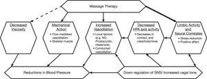 The link between massage therapy and blood pressure is still being explored. In 2015, Nicole Nelson MSH, LMT of the University of North Florida published a scoping review summarizing the current knowledge of massage’s mechanisms of action on BP. She analyzed 27 publications dealing with this topic, and concluded that there are 6 potential BP-mediating pathways. The chart below illustrates these pathways: