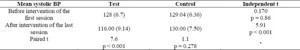 Massage therapy is universally praised for its relaxation-inducing effects, but there are further health implications for stress reduction. Researchers are beginning to explore the link between massage therapy and blood pressure. A 2011 Iranian study was conducted on 50 female patients diagnosed with prehypertension, classified as BP values between 120/80 and 140/90 taken on 2 separate occasions, who did not take BP medications. The intervention group received a 10-15 minute Swedish back massage 3 times a week for 10 sessions total, while the control group relaxed during this time but did not receive massage. Blood pressure was measured before and after each session. There was a significant drop in both the systolic and diastolic BP values of the intervention group, but no decrease in BP of the control group. Here are the tables illustrating the results of the study: