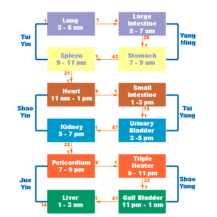 The times, etc. are not entirely part of this theory per se but of Chinese Medicine generally. All of these relationships are described on my acupuncture points diagram (shown below, taken from the acupuncture points database). Many people miss the information on the graphic because they are not aware of all of these theories. The graphic shows not only the obvious meridian names but also these 6 stage meridian pairings (tai yang, shao yang, etc.), the meridian activity times based on the Chinese Clock (when the meridians are most active and conversely when they are least active), and the entry exit points (note - not always the first and last points on the meridians, see the entry exit points theory section for more information).